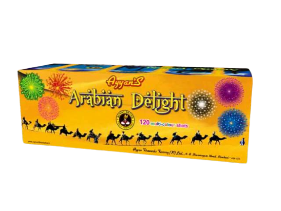 Introducing Arabian Delight 120 Shots M.C from Ayyan Fireworks! This amazing firework is sure to light up your Diwali celebrations with its dazzling display of bright colors and loud bangs. It features 120 shots of multi-colored stars, crackles, and whistles that will fill the sky with a mesmerizing show. This firework is made in Sivakasi, Tamilnadu by Sivakasi Enterprises and is shipped directly from there to all over India. Get ready for an unforgettable experience with Arabian Delight 120 Shots M.C from Ayyan Fireworks!